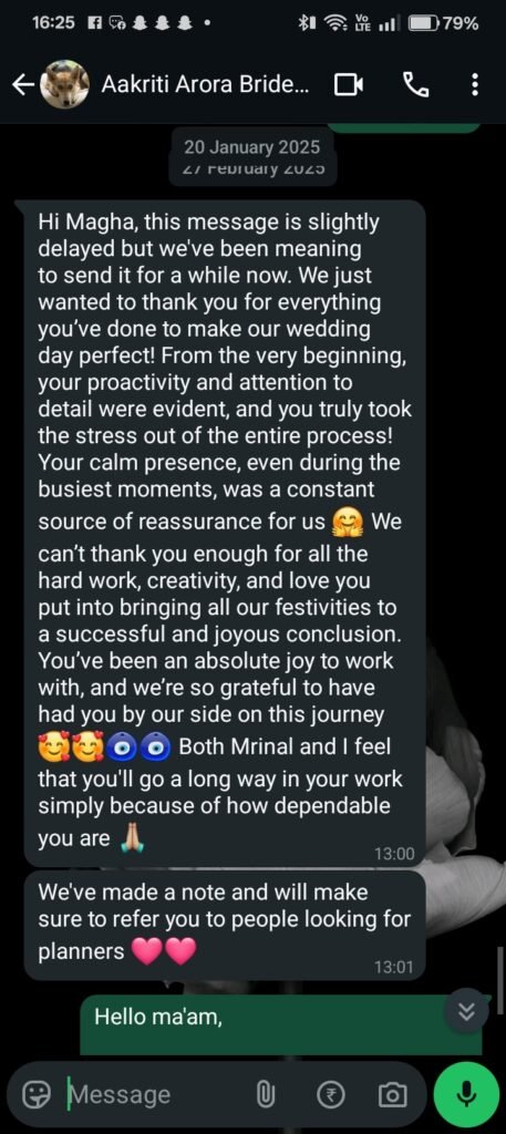 We don’t just plan weddings, we create unforgettable stories. We focus on the details that matter most to you, making your wedding a personal reflection of your love. Your story is our canvas, and every detail, meticulously chosen, whispers a chapter of your happily ever after.